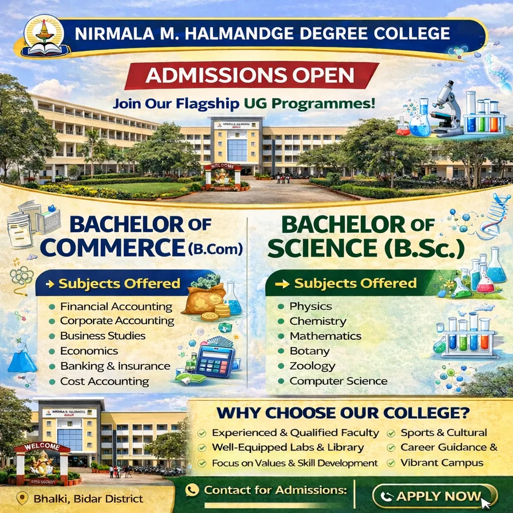 Nirmala M. Halmandge Degree College, Bhalki, Bidar is one of the well-established colleges dedicated to providing quality higher education under the guidance of its managing body. Inspired by the vision of delivering accessible and value-based education, the institution strives to uplift students, especially from rural and backward regions of Bidar district.